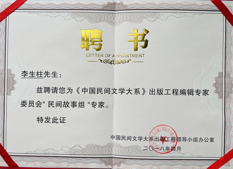 据悉,这是李生柱第二次受聘于中国民间文艺家协会。2018年4月,李生柱曾受聘为中国民协组织实施的《中国民间文学大系》出版工程编辑专家委员会“民间故事组”专家。