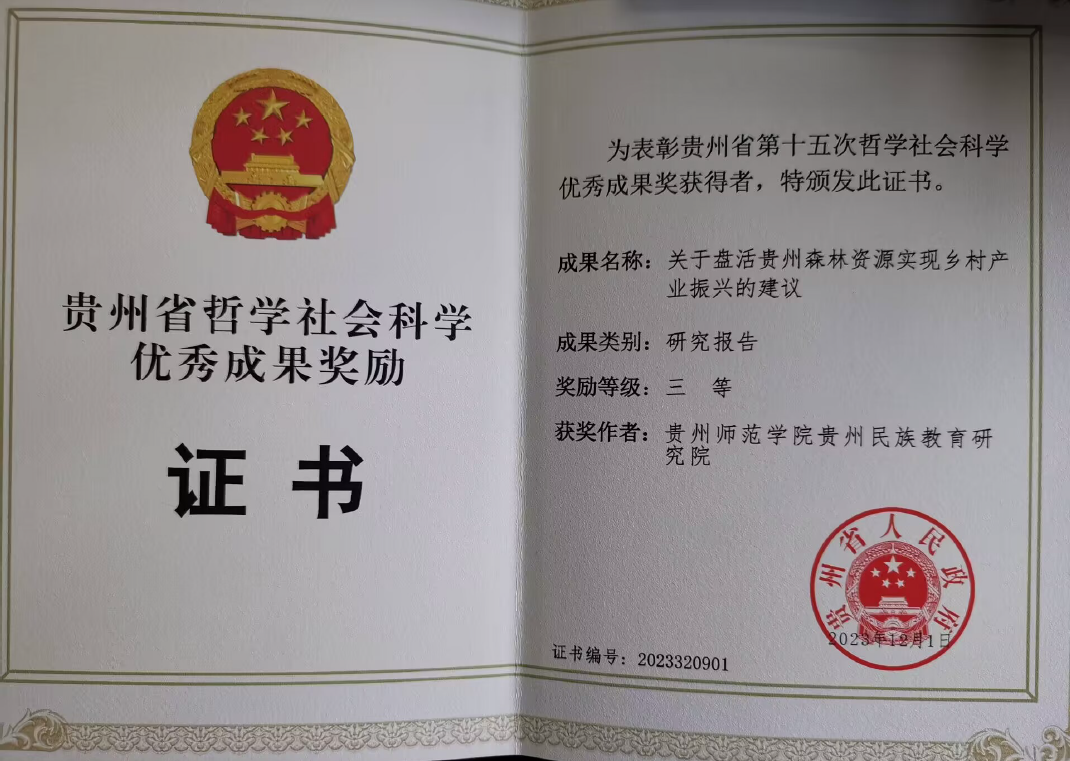 在贵州省第十五次哲学社会科学优秀成果奖评选中,我院院长刘大泯团队撰写的咨政报告《关于盘活贵州森林资源实现乡村产业振兴的建议》荣获三等奖。该奖项由贵州省人民政府设立,旨在表彰为全省哲学社会科学繁荣发展作出突出贡献的研究成果。