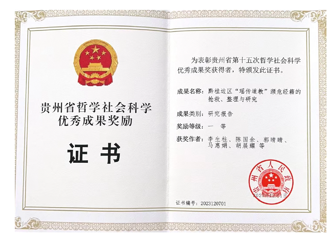 贵州省第十五次哲学社会科学优秀成果奖近日揭晓,我院研究院李生柱团队(李生柱、陈国余、郭晴晴、马惠娟、胡展耀等)完成的调研报告《黔桂边区“瑶传道教”濒危经籍的抢救、整理与研究》荣获一等奖,实现我院在该奖项一等奖“零”的突破。